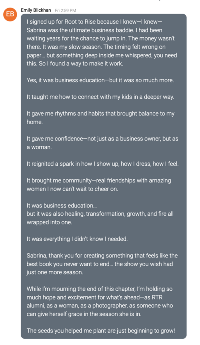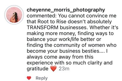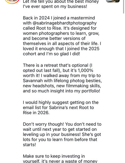 That’s why I created Root to Rise. Because I know firsthand: what got you here won’t get you to the next level. And I’ve now helped dozens of photographers break through the same plateau into businesses, and lives, that feel aligned, profitable, and joyful.